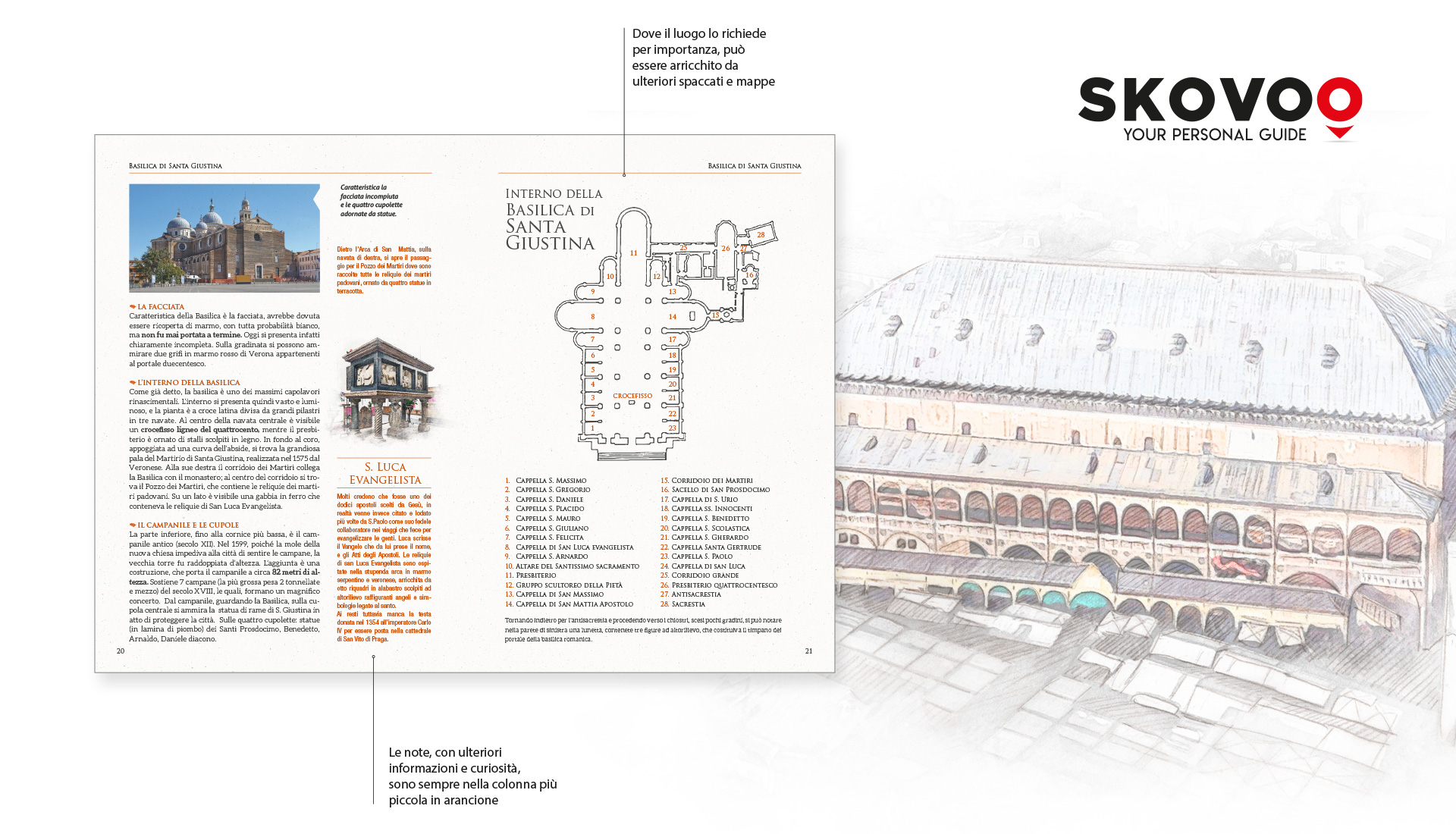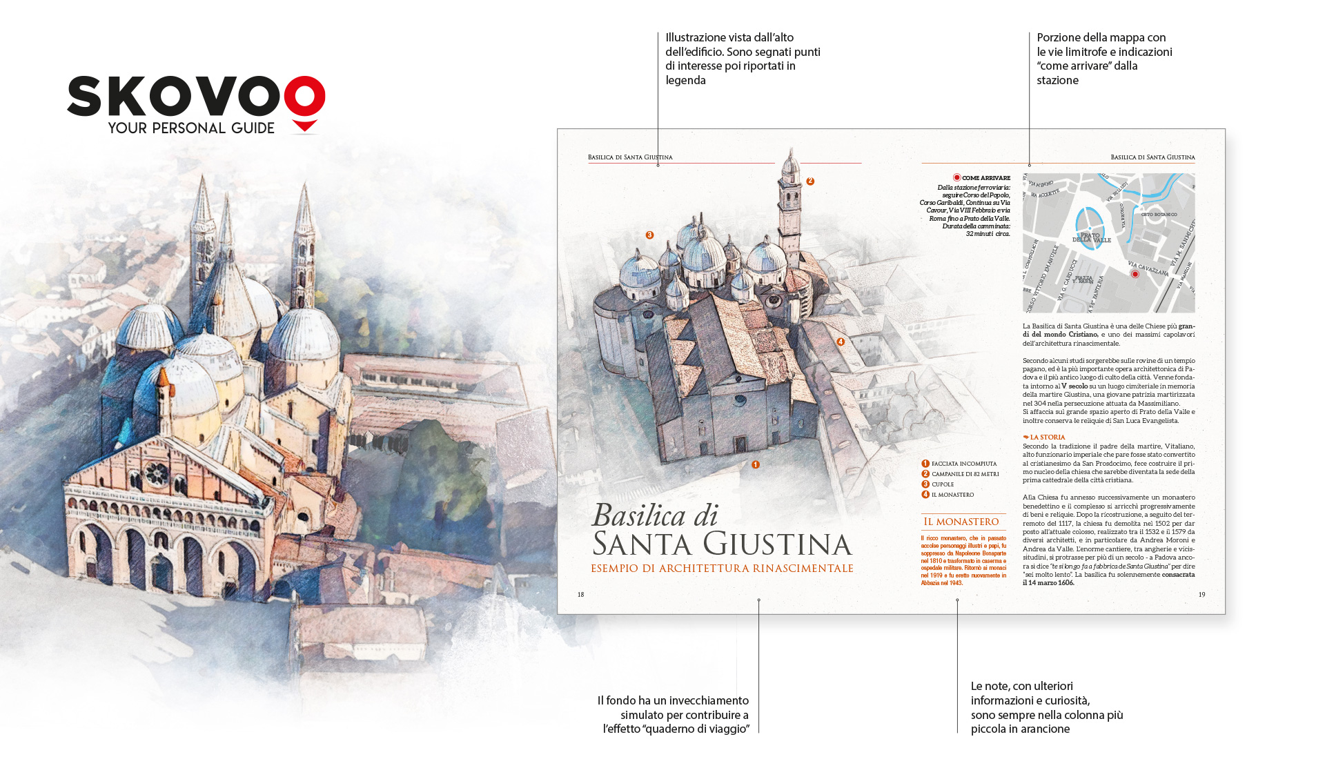 Per realizzare la guida ho vestito i panni di un viaggiatore, cosa che tutti noi siamo stati. Ho cercato quindi di mettere in luce i punti di interesse classici, realizzando le illustrazioni a doppia pagina e fornire informazioni non solo tecniche e storiche ma ho soprattutto mettendo l’accento sui principali eventi e sulle curiosità legate ai luoghi da visitare.